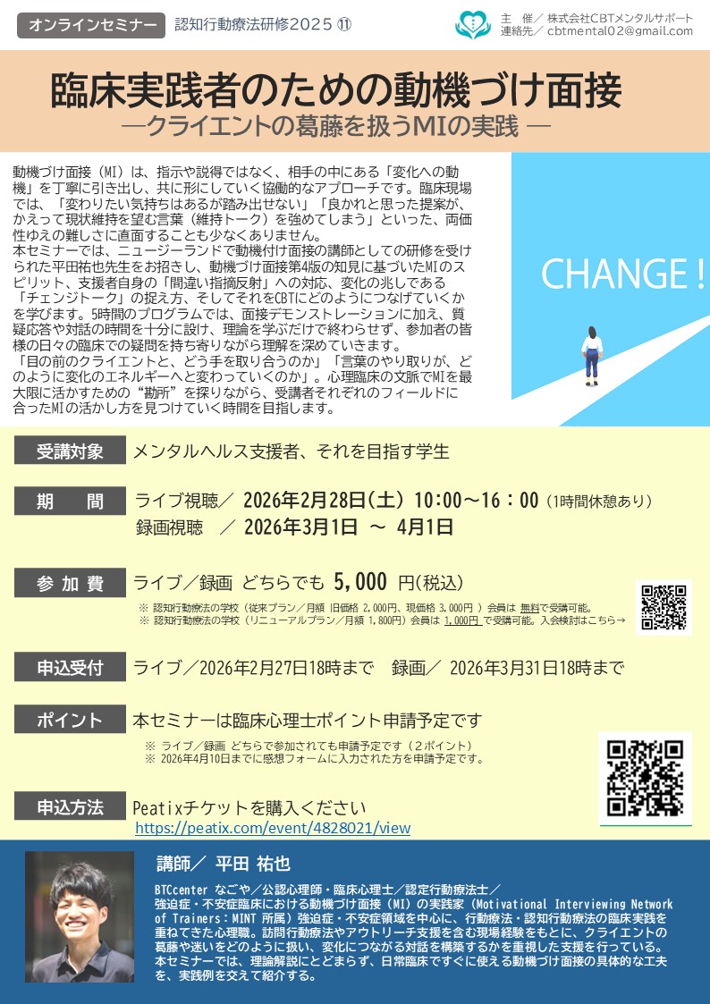 本セミナーでは、ニュージーランドで動機付け面接の講師としての研修を受けられた平田祐也先生をお招きし、動機づけ面接第4版の知見に基づいたMIのスピリット、支援者自身の「間違い指摘反射」への対応、変化の兆しである「チェンジトーク」の捉え方、そしてそれをCBTにどのようにつなげていくかを学びます。5時間のプログラムでは、面接デモンストレーションに加え、質疑応答や対話の時間を十分に設け、理論を学ぶだけで終わらせず、参加者の皆様の日々の臨床での疑問を持ち寄りながら理解を深めていきます。